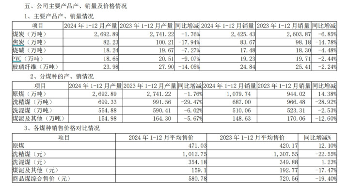年报显示,2024年冀中能源主要产品产、销量同比均不同程度下降。具体看,煤炭产量下滑1.76%,销量下滑6.85%;焦炭产量下滑17.94%,销量下滑14.78%;烧碱产量下滑7.27%,销量下滑4.48%;PVC产量下滑9.07%,销量下滑2.44%;玻璃纤维产量下滑14.05%,销量下滑2.24%;